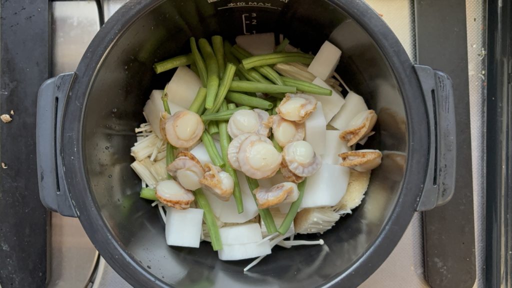 いんげん、ほたての順に入れる
