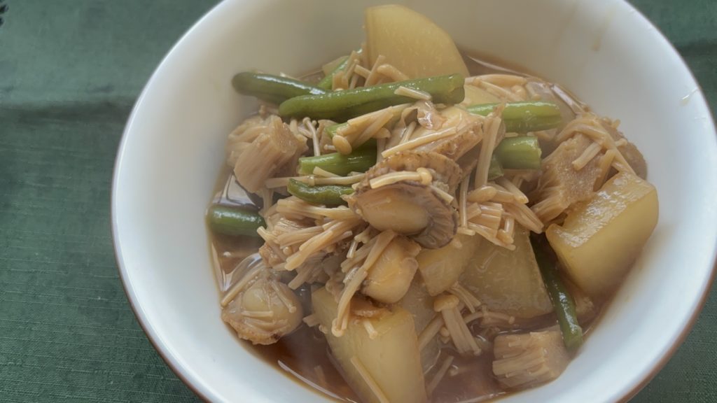 ほたての旨味が大根とえのきにしっかり染み込み、ご飯に合う一品です。いんげんの爽やかな香りと彩りが加わることで、優しい味わいの中にしっかりとした満足感があります。素材の味を楽しめる和の煮物です。
