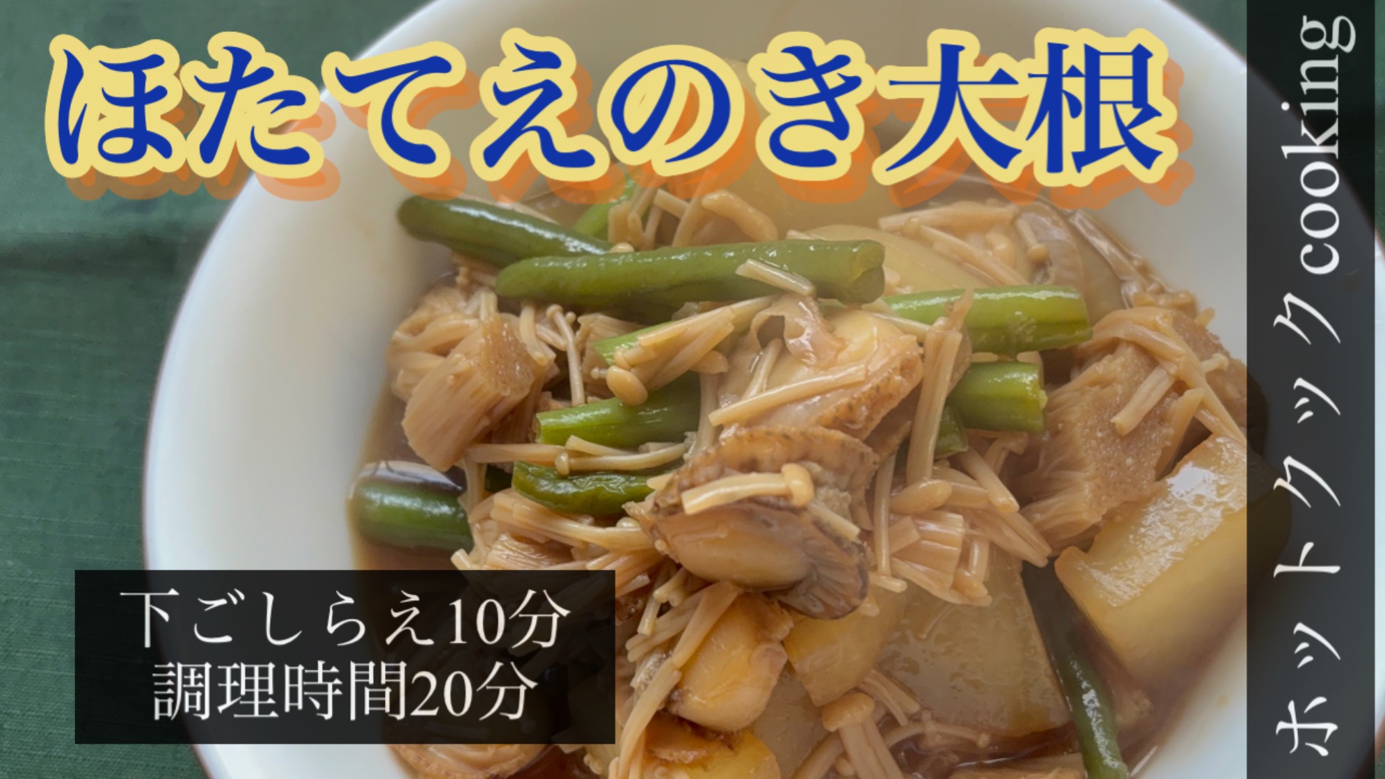 「ほたてえのき大根」は、やさしい味付けの中にほたての旨味がしっかり生きた、体にも心にも優しい煮物です。大根とえのきでボリュームもあり、いんげんの彩りで見た目も華やか。日常のおかずにも作り置きにもぴったりな一品です。
