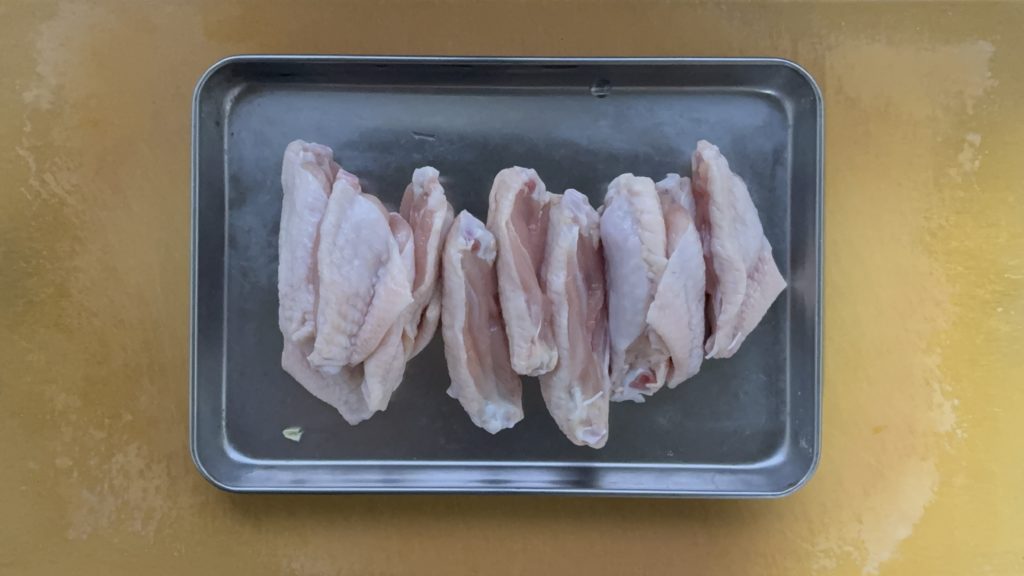 手羽中は骨に沿って2ヶ所切り込みを入れ、塩をまぶす