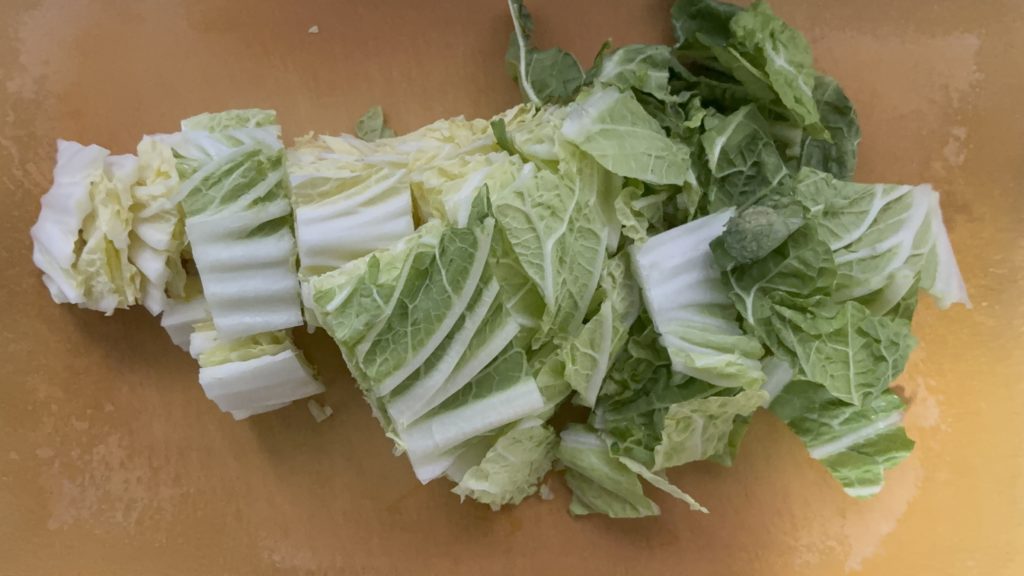 白菜は横に半分に切り、ざく切りにする