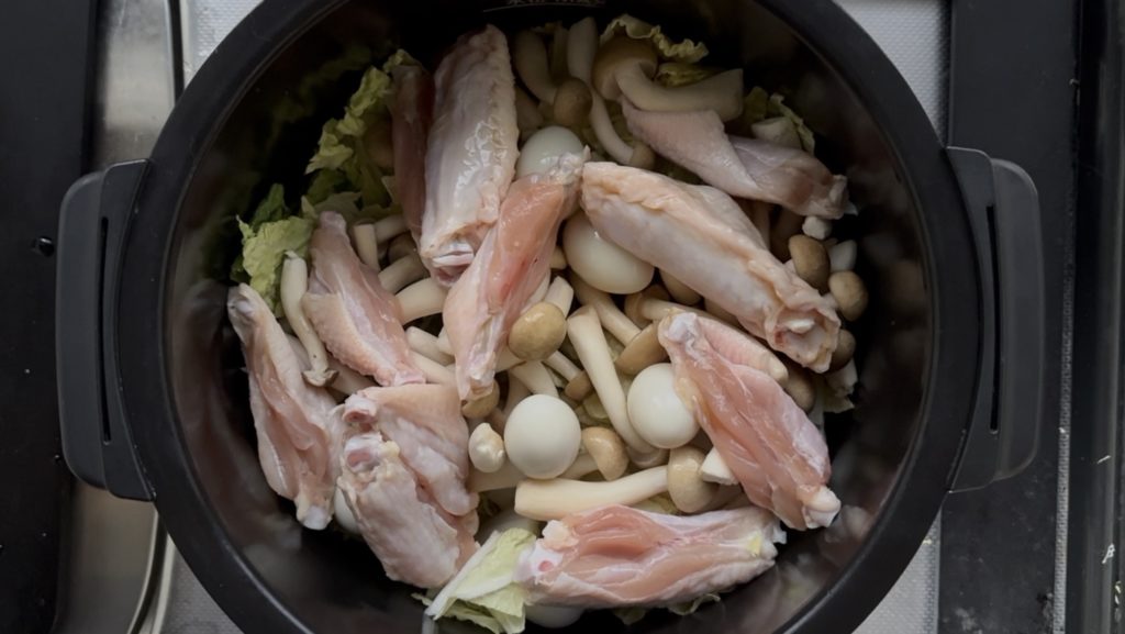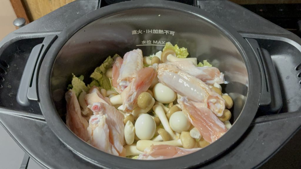 うずら卵、手羽中の順に入れる