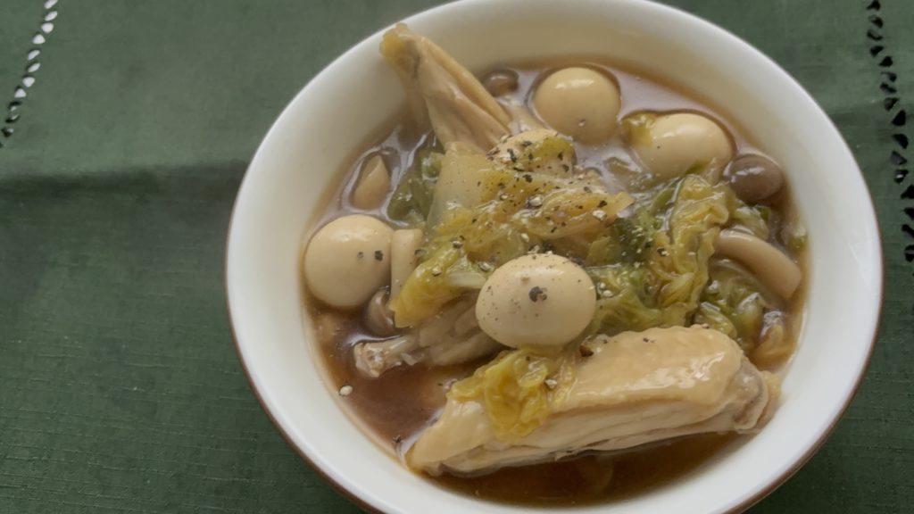 柔らかく煮えた白菜と、こんがりとした色味の手羽中が食欲をそそり、うずら卵の白とブラックペッパーの黒がアクセントになります。全体の色合いがバランスよく、食卓を温かく彩ります。