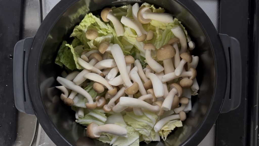 鍋に白菜、しめじの順に入れる