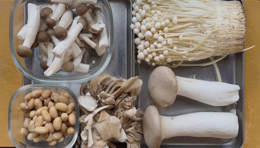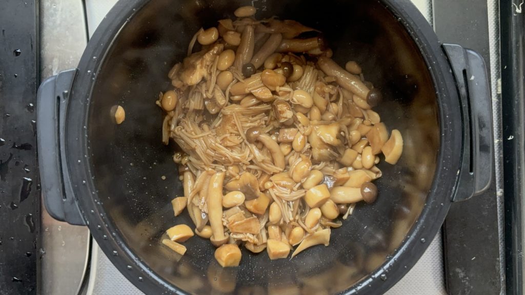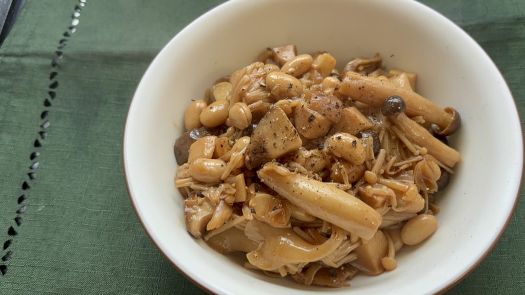 大豆のほっくり感と4種のきのこの多彩な食感が楽しめます。えのきのやわらかさ、エリンギの弾力、まいたけとしめじのしっかりした歯ごたえが合わさり、食べ応えのある一品に仕上がります。