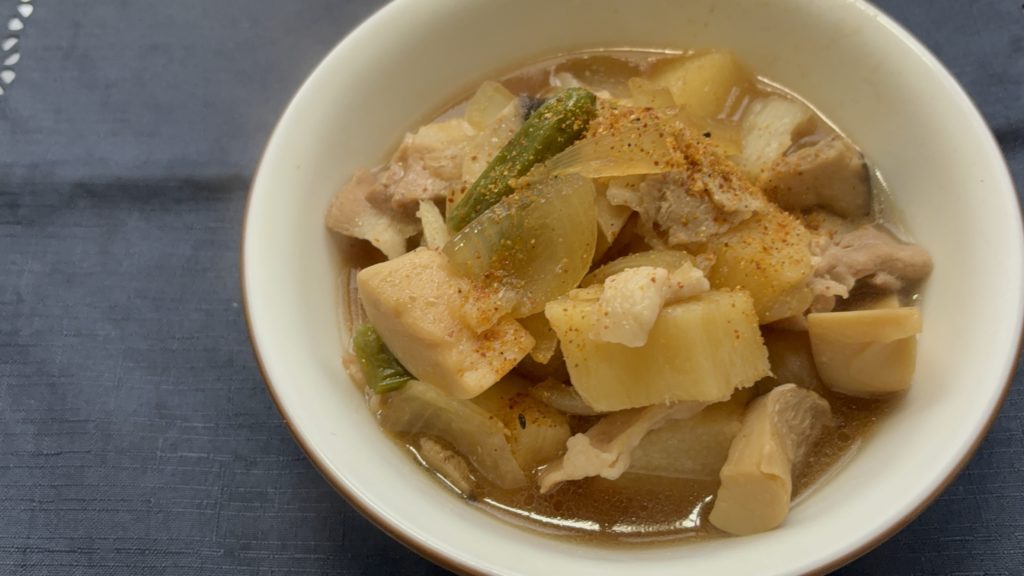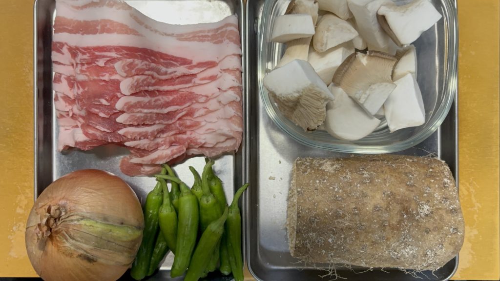 長芋のほくっとした柔らかさと、とろっとした食感が特徴です。豚肉はしっとりやわらかく、エリンギは歯ごたえがあり食感のコントラストが楽しめます。玉ねぎの甘みと柔らかさも加わり、全体として心地よい食べ応えです。