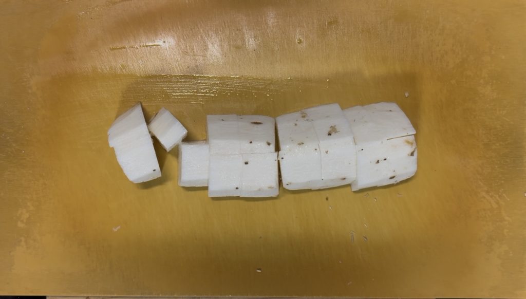 鍋に玉ねぎ、エリンギ、長芋の順に入れる