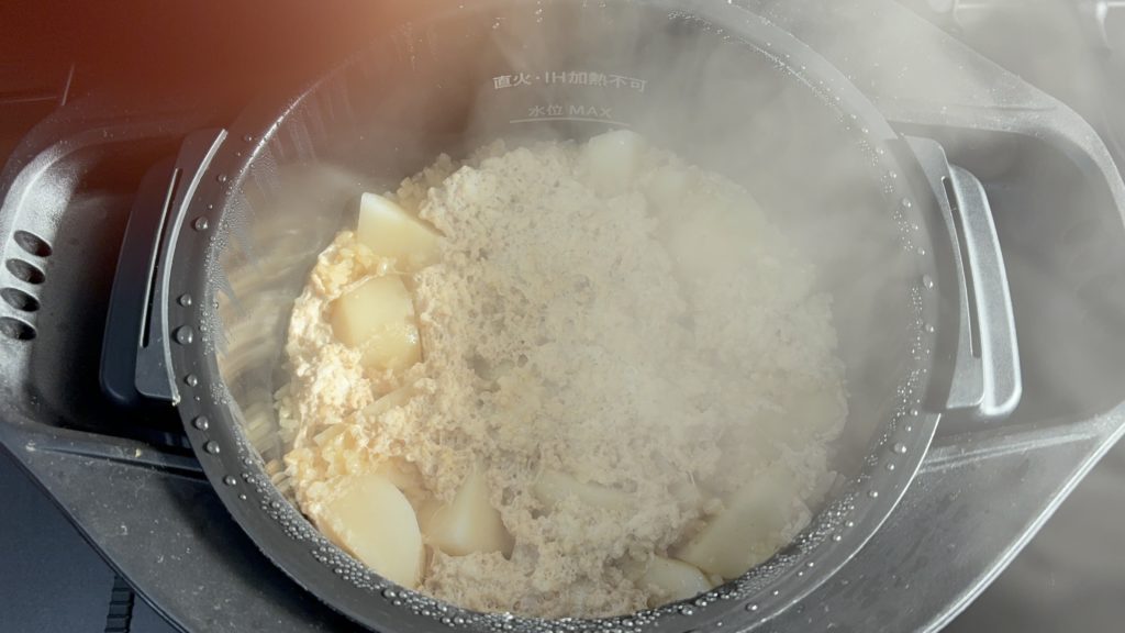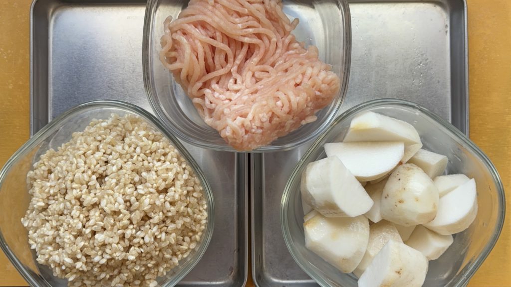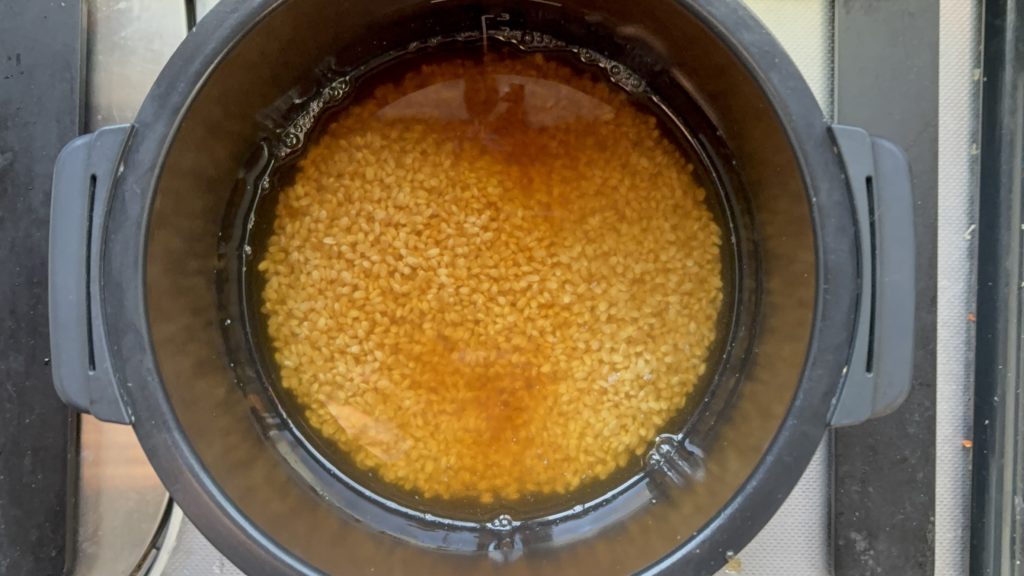 全体の調理時間は60分ほどかかります。下ごしらえに15分、玄米の加熱に45分ほどです。