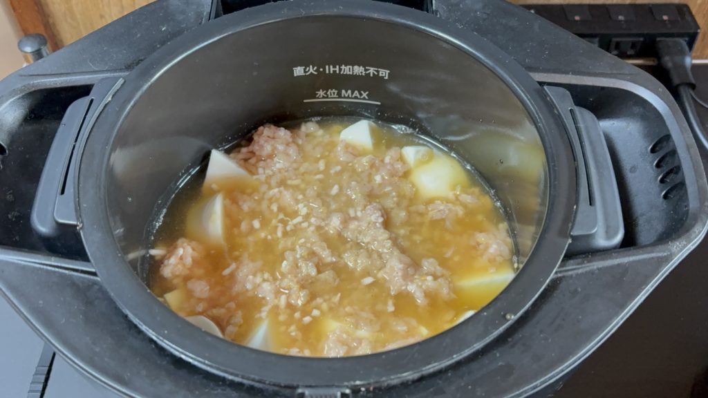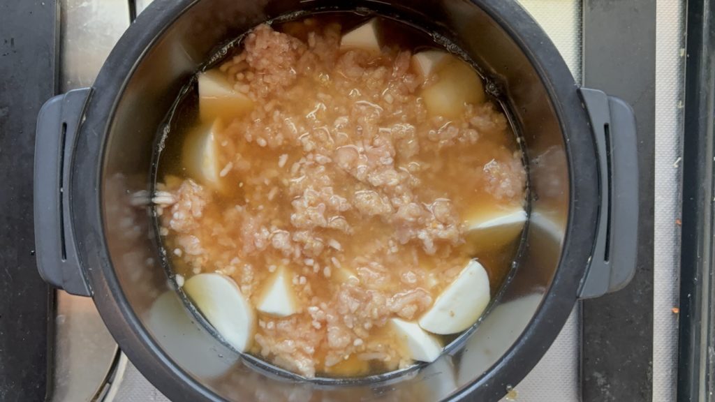 里芋、鶏ひき肉を入れ、軽くかき混ぜる