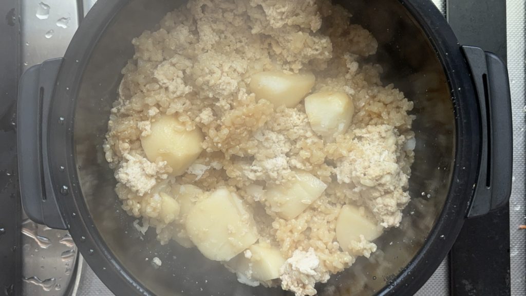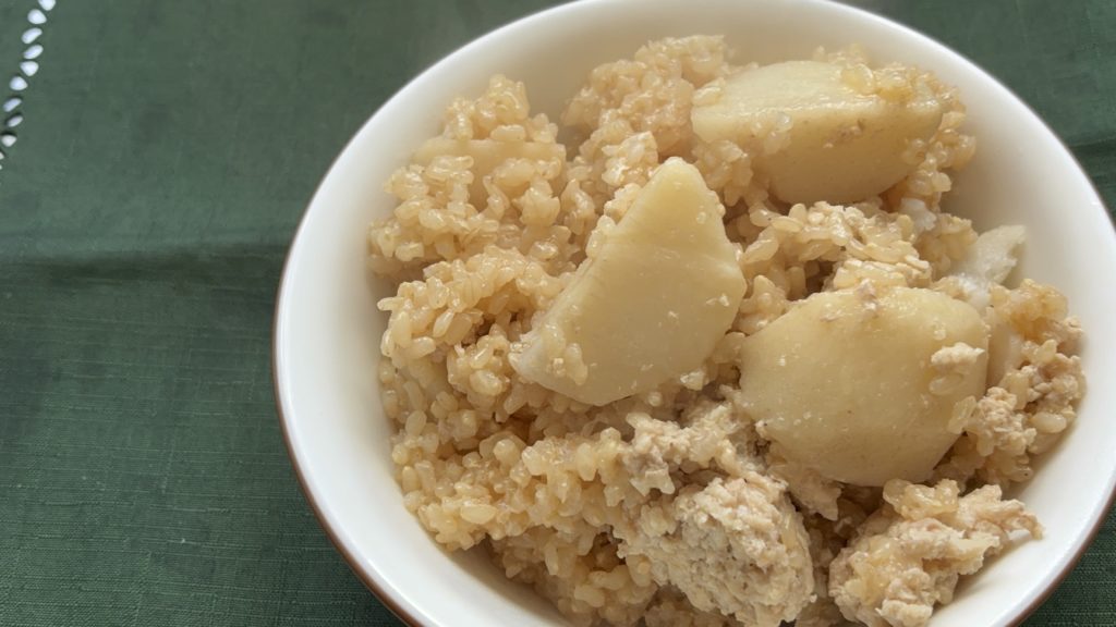 鶏ひき肉の旨味と、ねっとりホクホクに仕上がった里芋が玄米に染み込む、やさしい味わいの炊き込みご飯です。