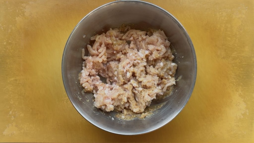 別のボウルに鶏ひき肉と合わせ調味料を入れ、軽くかき混ぜる