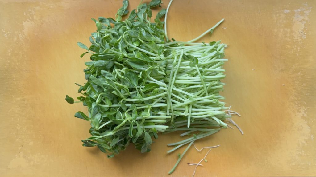 豆苗は根を落として横に2等分に切る