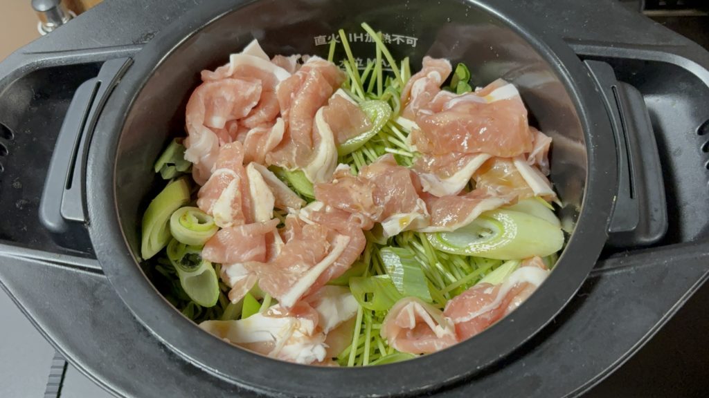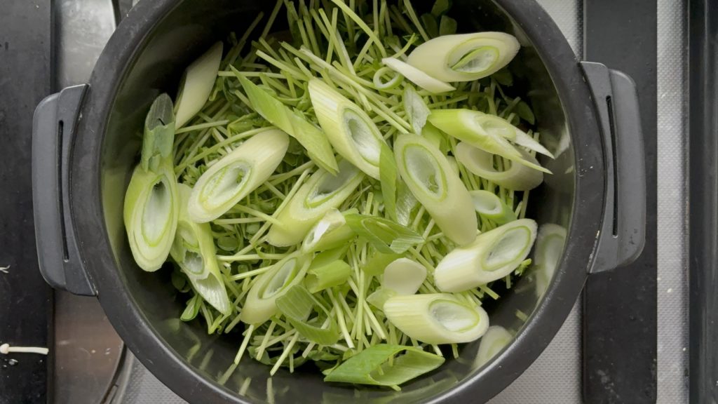 豆苗、白ネギの順に入れる