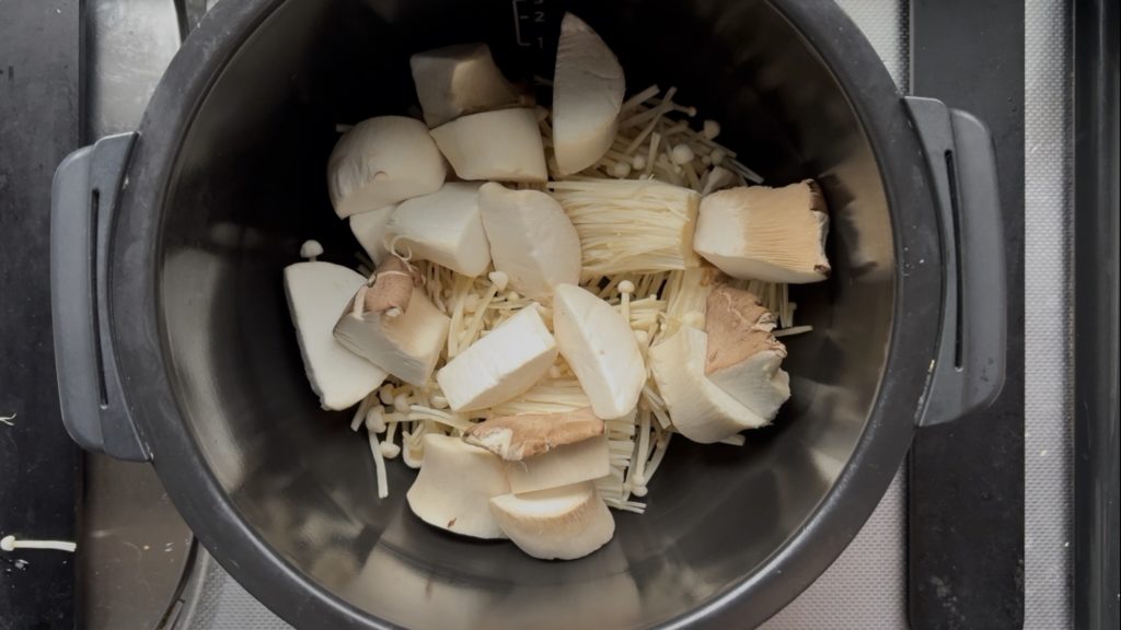 鍋にえのき、エリンギの順に入れる