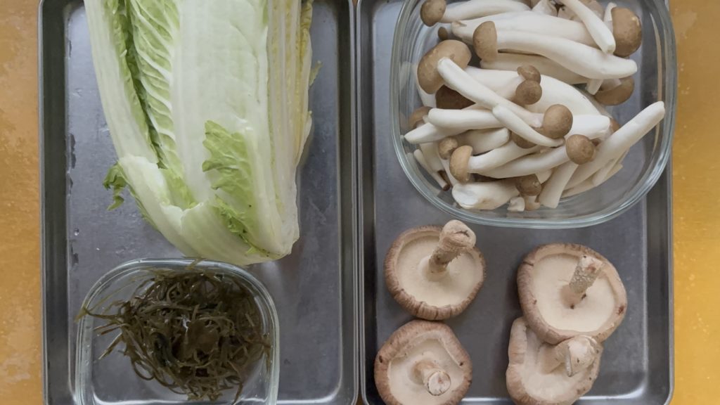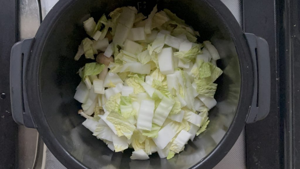 鍋にしめじ、白菜の順に入れる