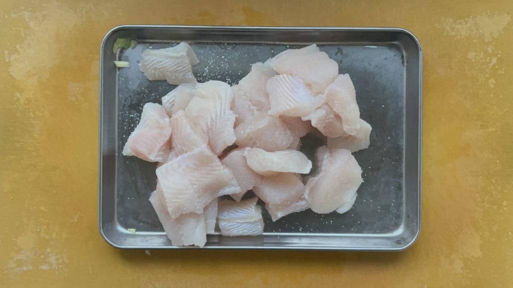 白身魚は一口大に切り、塩をまぶす