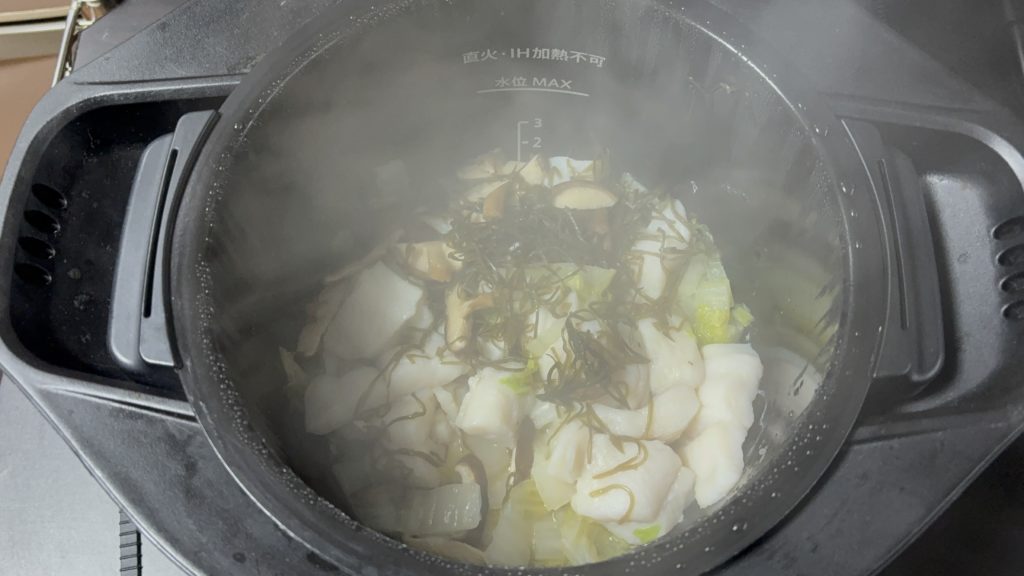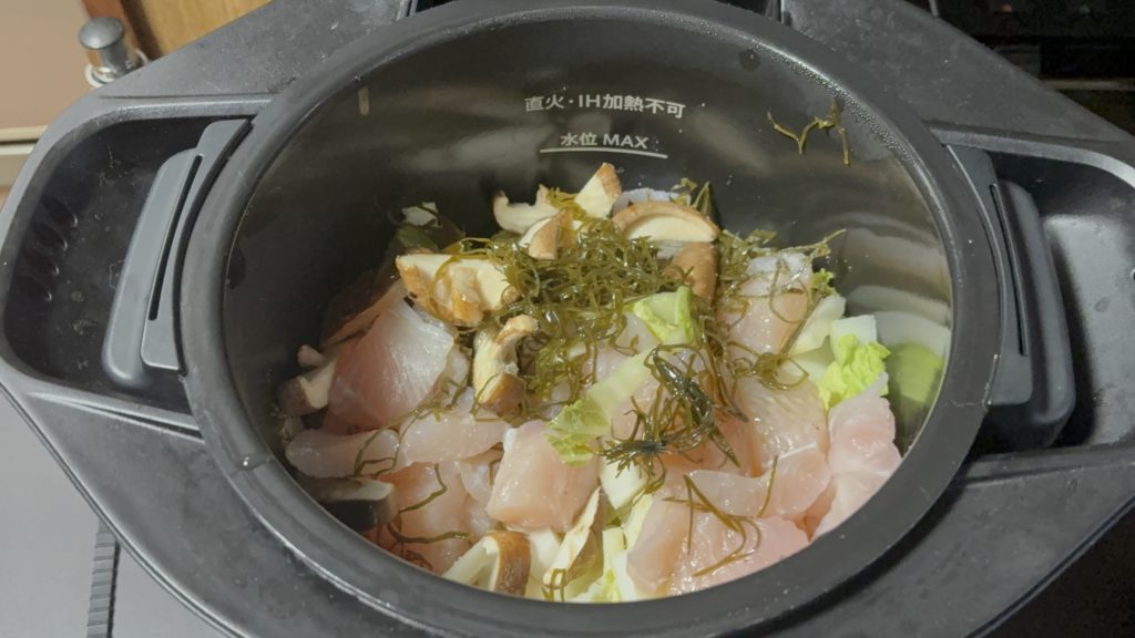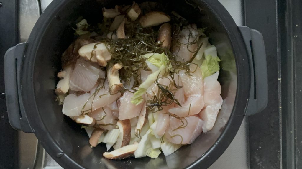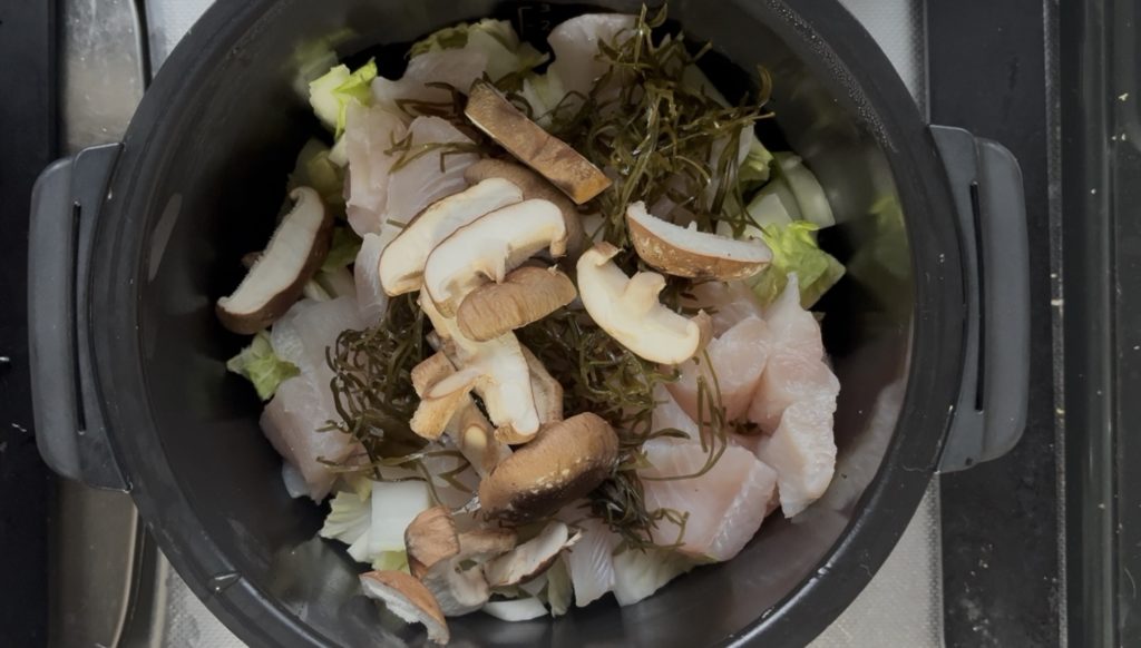 白身魚、しいたけ、刻み昆布の順に入れる