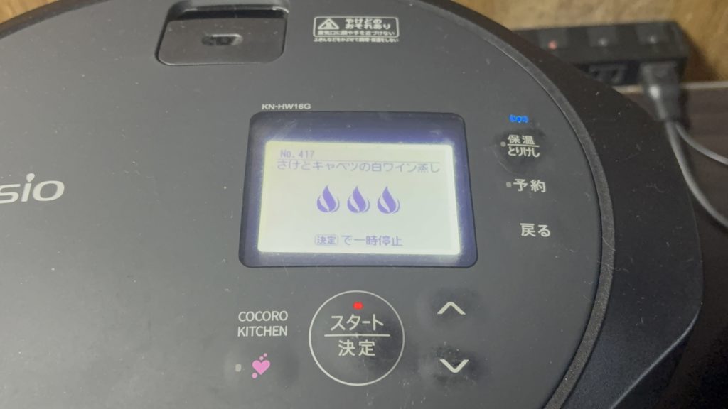 メニューを選ぶ→メニュー番号を選ぶ→417→【さけとキャベツの白ワイン蒸し】で調理スタート