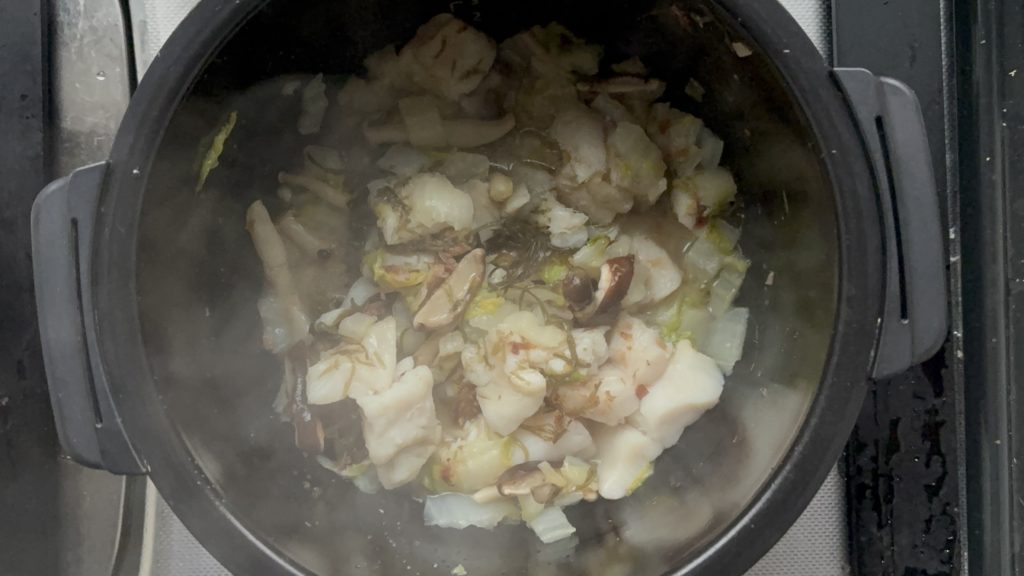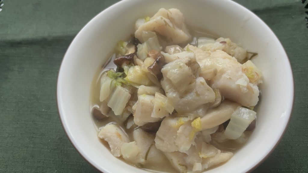 ふんわりとした白身魚と、とろっと柔らかくなった白菜のコントラストが楽しめます。しめじとしいたけのほどよい歯ごたえが加わり、蒸し料理ながら単調にならない食感です。