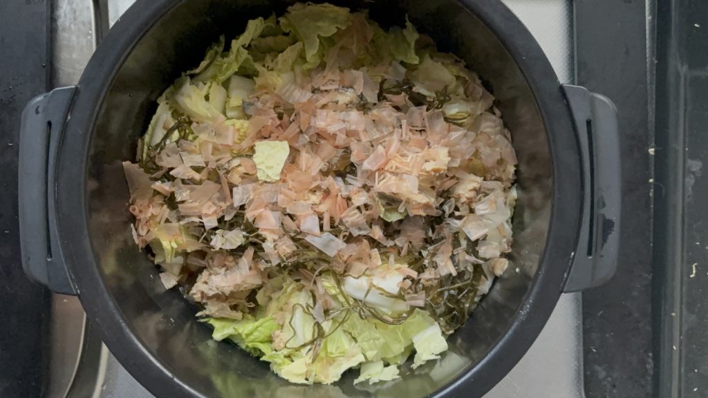 白菜、さばの水煮缶、刻み昆布、鰹節を加え、軽くかき混ぜる