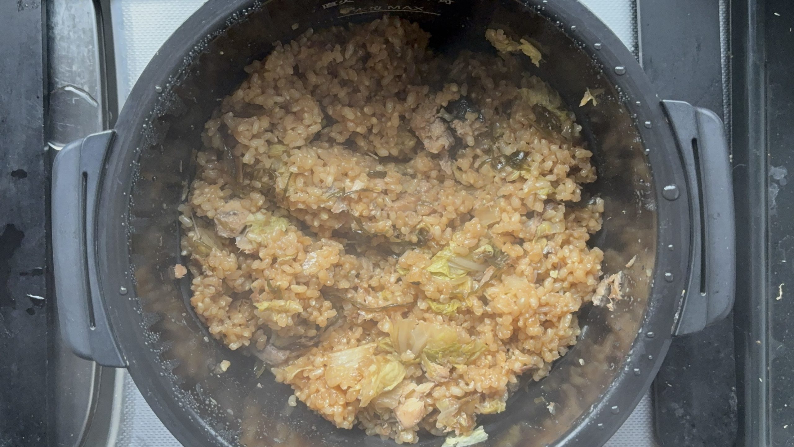 白菜とサバ缶の旨味をたっぷり吸い込んだ、和風仕立ての玄米炊き込みご飯です。