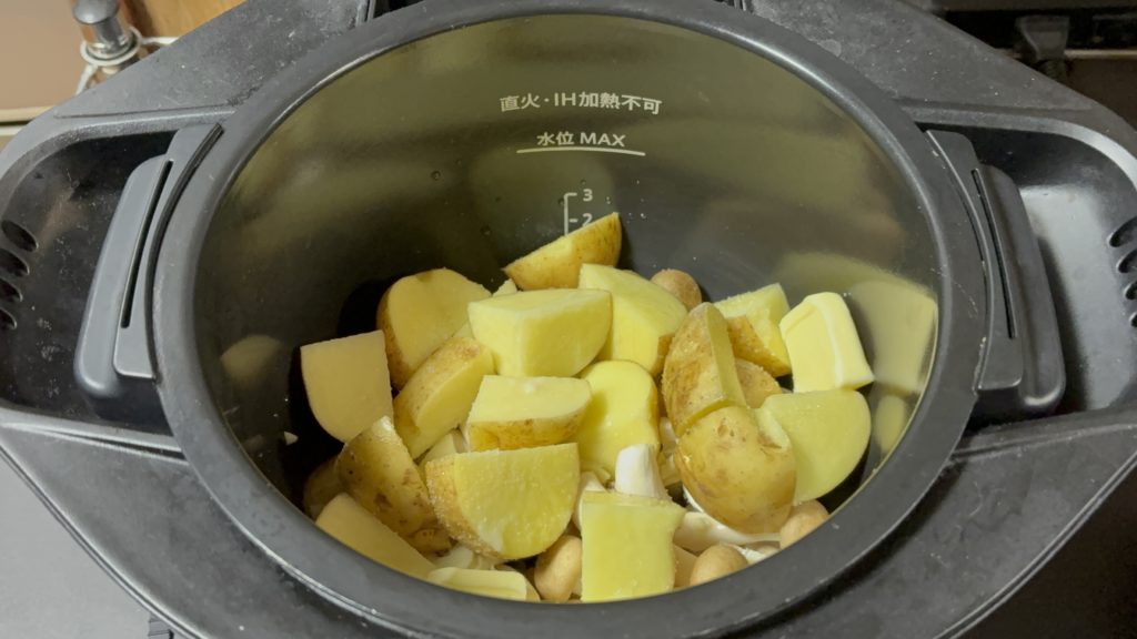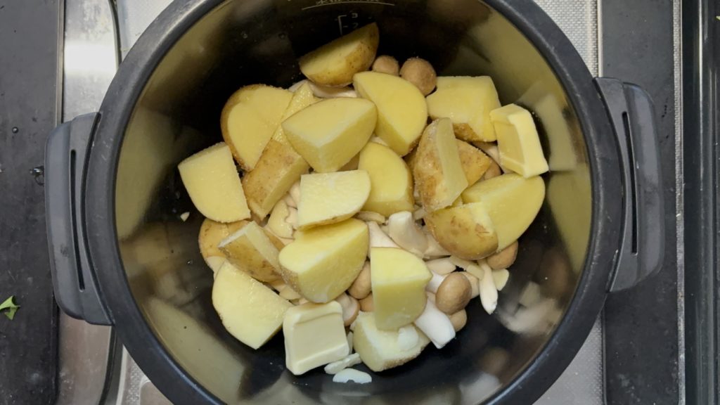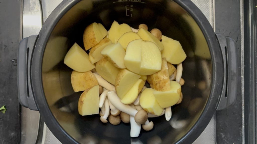 鍋にしめじ、じゃがいも、にんにくの順に入れる
