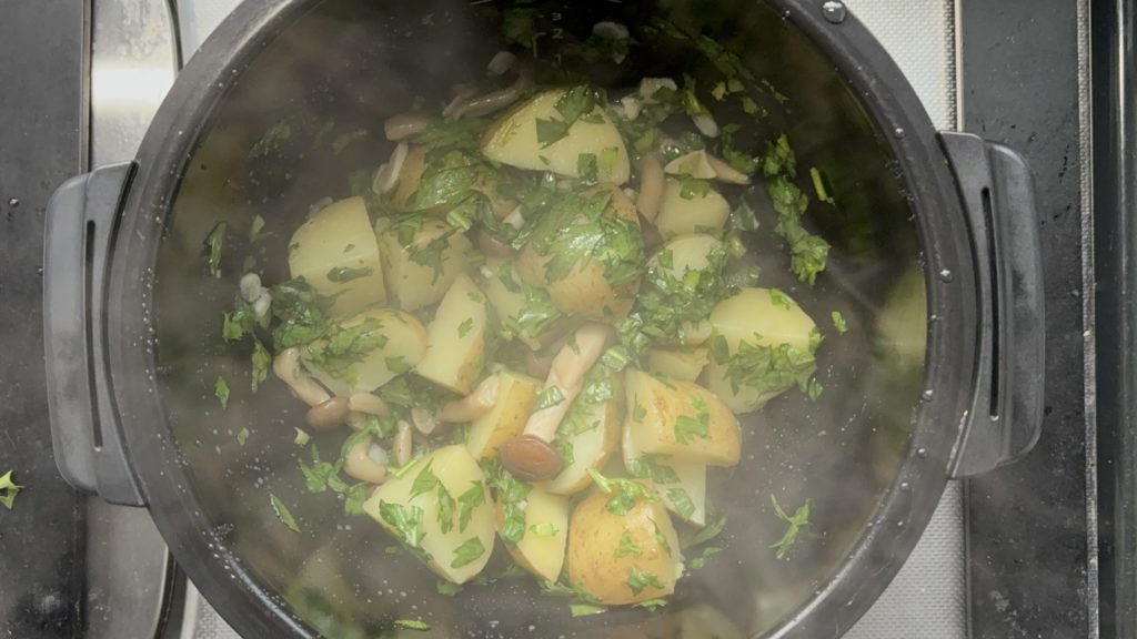 ほくほくのじゃがいもとしめじの歯ごたえに、春菊のやわらかさが加わります。全体的に軽やかで、最後まで飽きずに食べ進められる食感です。