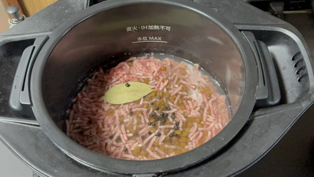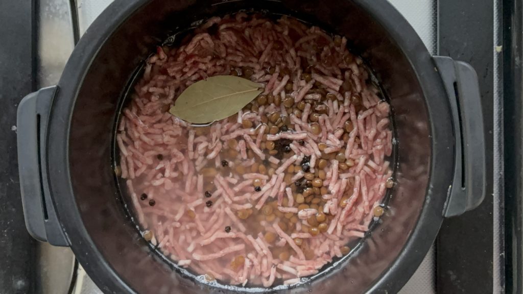レンズ豆、合い挽き肉、ブラックペッパー、ローリエを加え、軽くかき混ぜる