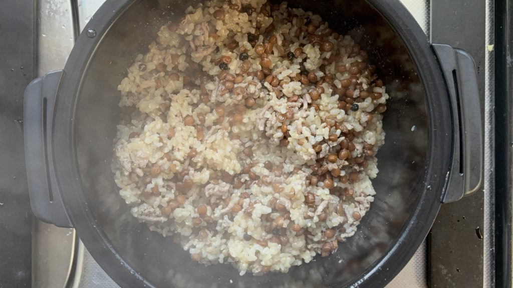 豆のコクと合い挽き肉の旨味が玄米にしっかり染み込み、噛むほどに味わいが広がります。