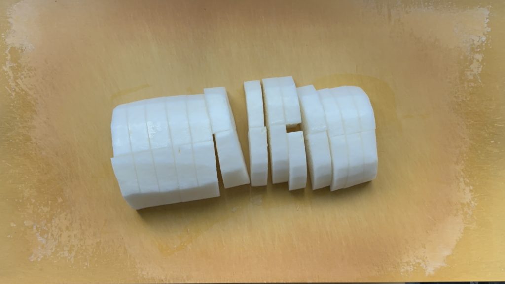 大根は皮を剥き、1cm幅のいちょう切りにする