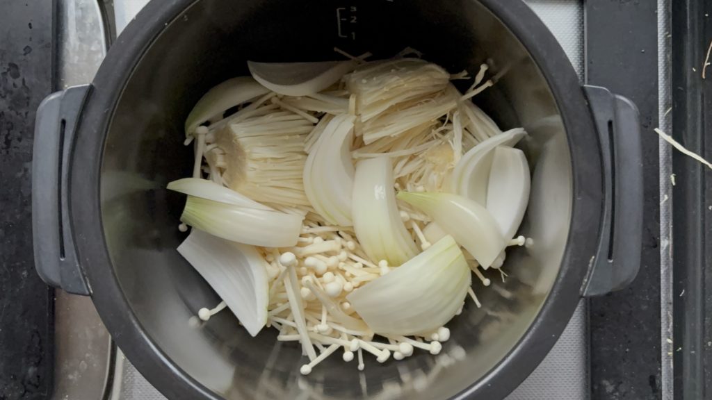 鍋にえのき、玉ねぎの順に入れる