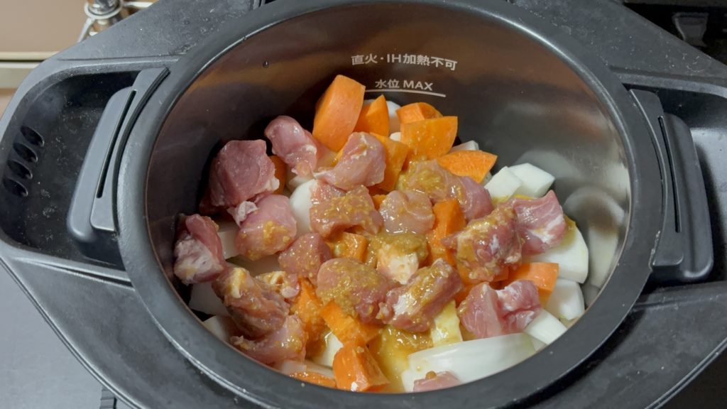 大根、にんじん、豚肉の順に入れる