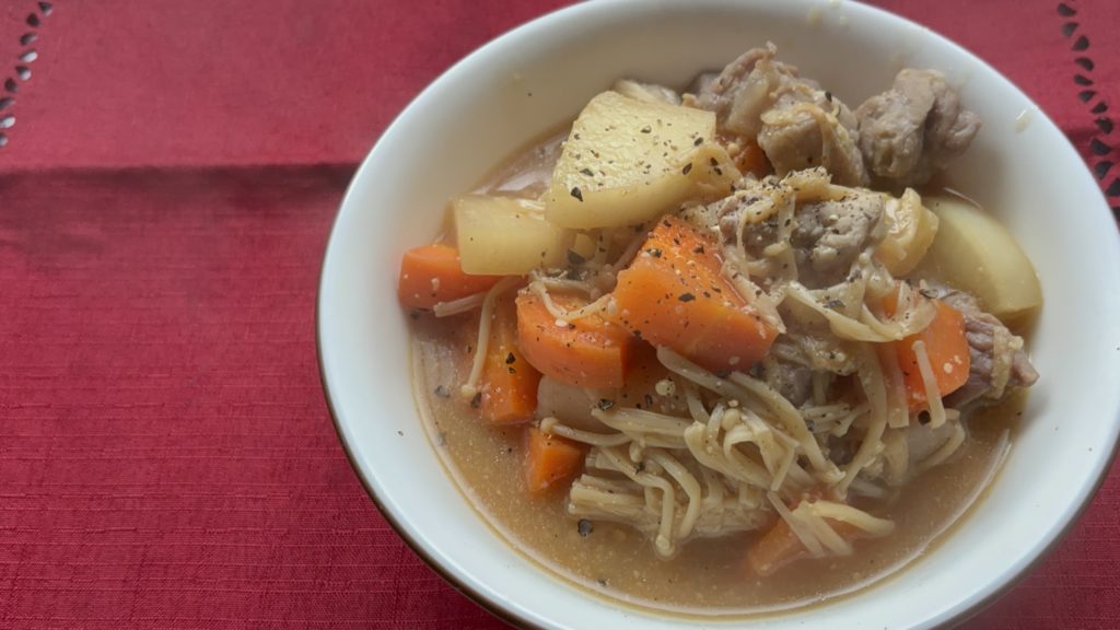 味噌とにんにくの風味が具材にしっかりしみ込み、豚肉のコクと野菜の甘みを同時に楽しめます。大根はやわらかく煮え、えのきが旨味を吸って全体に深みをプラス。ごはんのおかずとしても満足度の高い一品です。