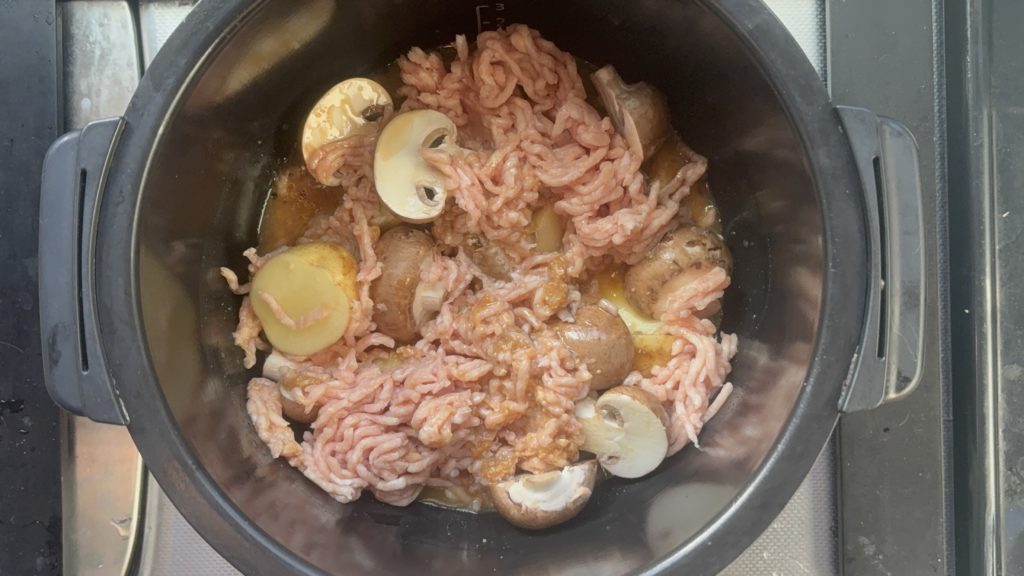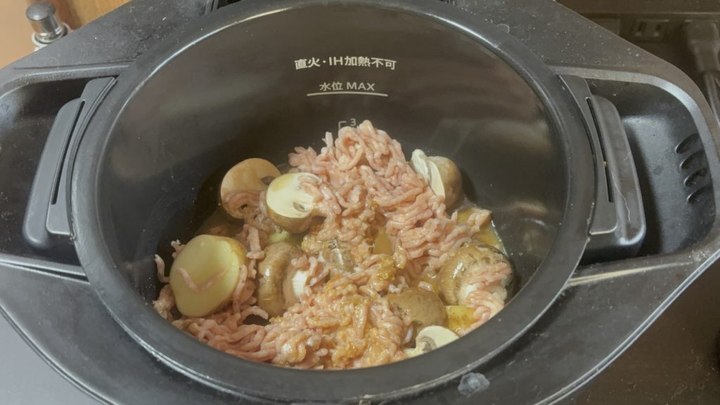 鍋に新じゃがいも、マッシュルーム、鶏ひき肉の順に入れる