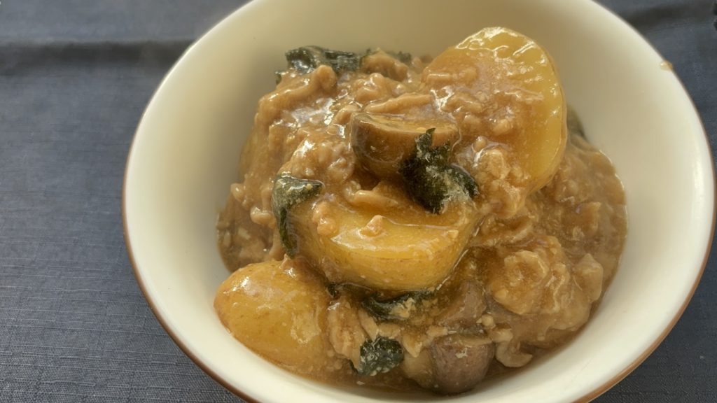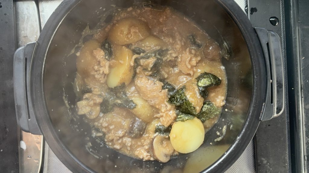 新じゃがのほくほくした食感と、そぼろ状の鶏ひき肉のやわらかさが心地よく重なります。マッシュルームのやわらかな歯ごたえも加わり、全体として食べやすく満足感のある食感に仕上がります。